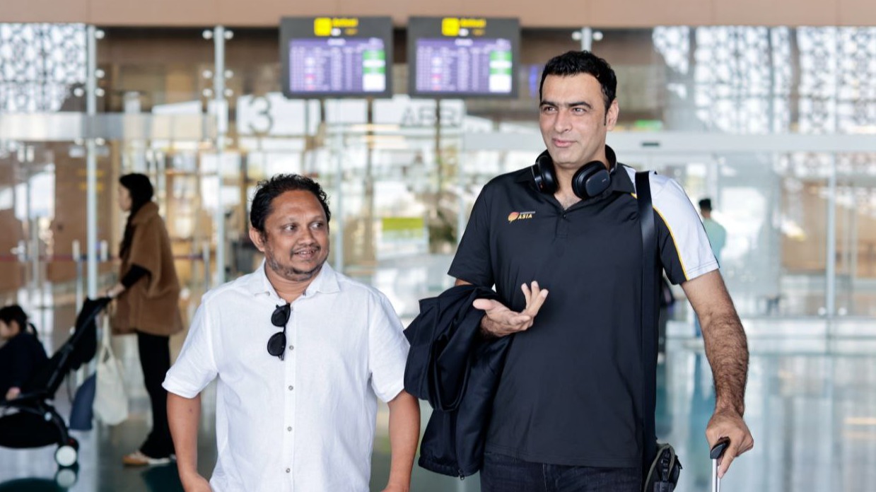 ބެޑްމިންޓަން އޭޝިއާގެ ޑިވެލޮޕްމަންޓް ކޮމިޓީގެ ޗެއާޕާސަން ވާޖިދު އަލީ ޗައުދަރީއަށް އެއަރޕޯޓުން ބެޑްމިންޓަން އެސޯސިއޭޝަން އޮފް މޯލްޑިވްސް (ބީއޭއެމް) ގެ ރައީސް އިޝްފާން މުޙައްމަދު މަރުޙަބާ ދަންނަވަނީ --- ފޮޓޯ: ޕީއެސްއެމް ނިއުސް