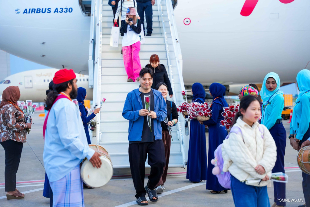 މޯލްޑިވިއަންގެ ފްލައިޓްގައި ޗައިނާއިން ރާއްޖެއަށް އައި ފަތުރުވެރިންނަށް މަރުހަބާ ކިޔުން. ފޮޓޯ: މޯލްޑިވިއަން